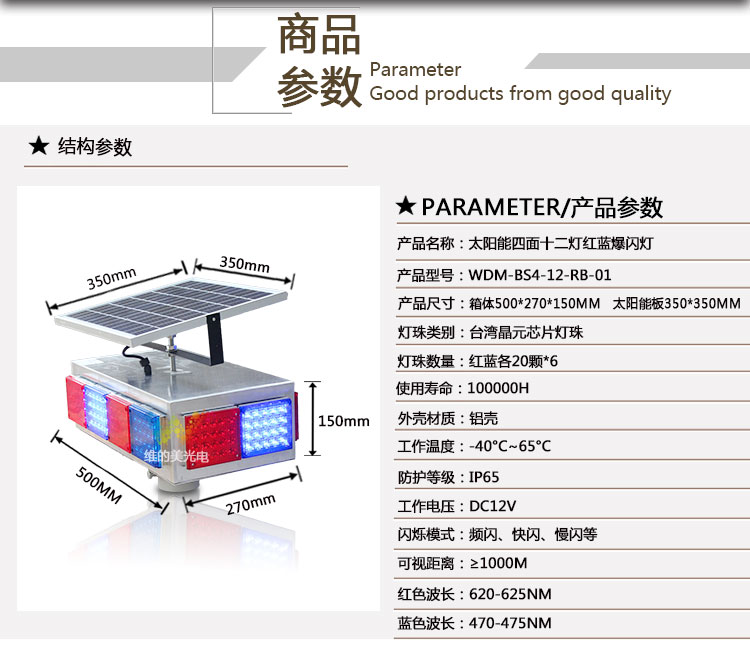 一、太陽能四面十二燈爆閃燈的參數(shù)明細(xì):
