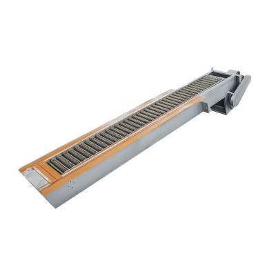 由尼龍或不銹鋼制成的耙齒按一定的排列次序裝配在鏈條軸上形成封閉式的環形齒耙鏈,整個耙齒鏈在傳動鏈輪的驅動下自下而上做連續循環式運動,將截留在耙齒上的固體懸浮物從污水中輸送到地面或平臺上,并在耙齒旋轉嚙合的過程中將物料清除,以達到保護水泵和減輕后續工序處理負荷的目的。